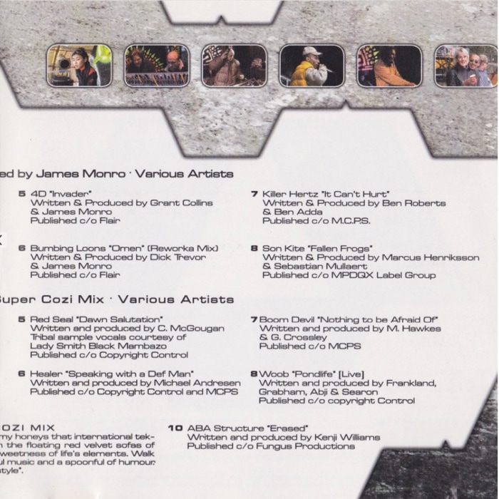 使用した曲はどれも当時のお気に入りで、特にエンディングの16分の美しい瞑想的アンビエント「Erased」は、旧友のケンジ・ウィリアムス (Medicine Drum) がAba Structureとして参加した曲で、とにかく好きな曲だった。彼がジョージと一緒に私とガスがその頃住んでいたデボンの家を訪れ、深夜に暖炉の前でサイチルのシーンについて延々と音楽オタク談義をしていたときにDATでくれた曲なんです。いい思い出だなあ、、”