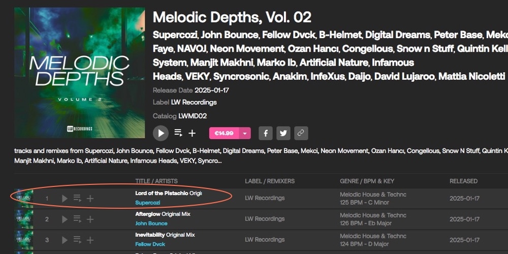 Melodic Depth Vol2 Compilation : Melodic Depth 2 Genre : Techno, House Label : LW Recordings (UK) Released : 2025, Jan 17 Format : Digital Featured Track : Lord Of Pistachio Buy on : Beatport Juno Listen Compilation on Spotify