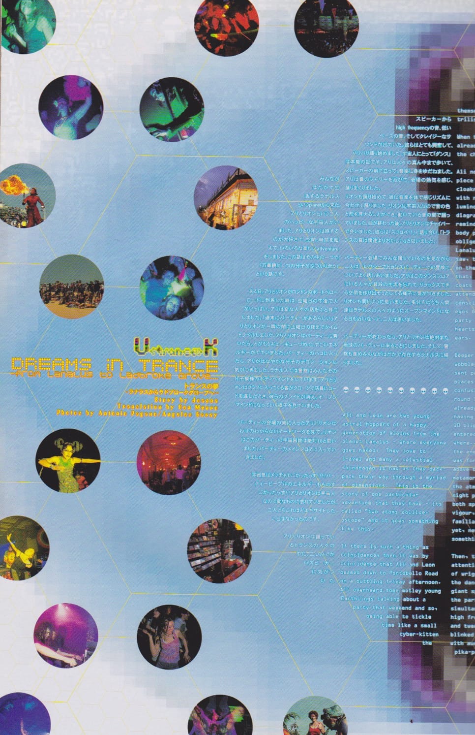 all contents were written in English and Japanese both. Each issue had a specific theme that connected with world wide rave movement and the many contents were under the influences of new age philosophy.