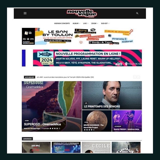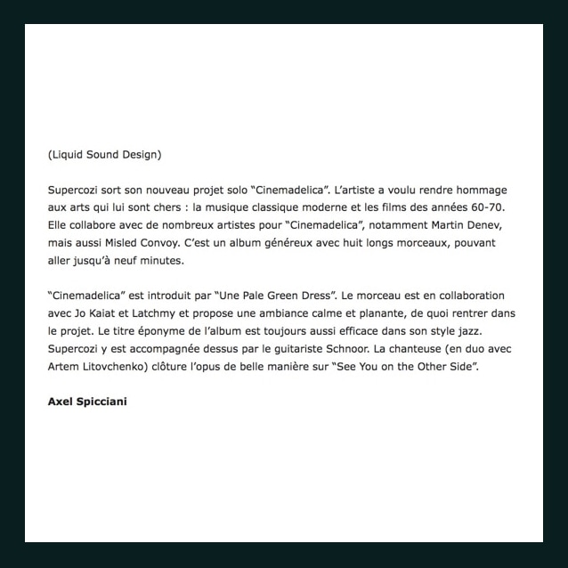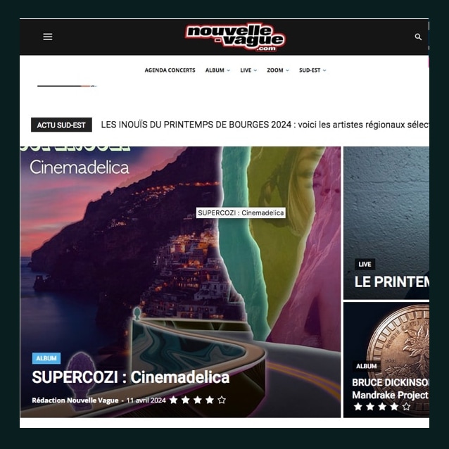 De bons commentaires sur le nouvel album de SUPERCOZI ‘ Cinemadelica ‘ apparaissent ici et là. Il s’agit d’une belle critique de l’album sur Nouvelle Vague Magazine, un magazine populaire et chic de la scène sub-culturelle du sud de la France. Ils ont publié la critique de l’album ‘ Cinemadelica ‘ en tête de leur classement musical mensuel tous genres confondus avec 4 étoiles ! Merci à Nouvelle Vague Magazine pour son soutien !!!