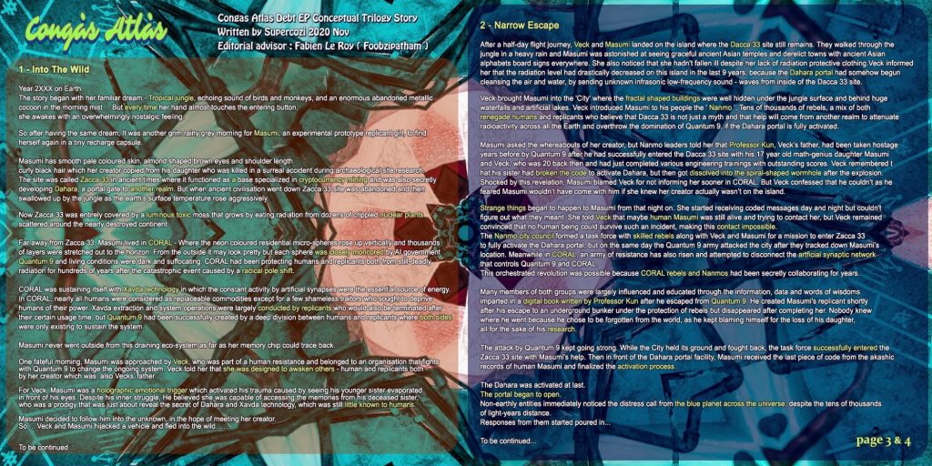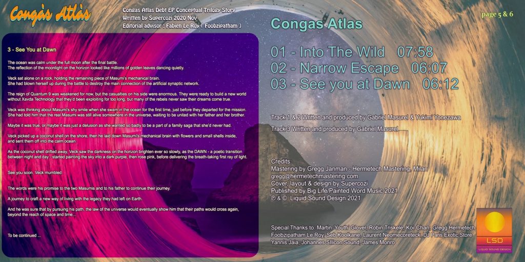 あと、今回のEP用に3部作の短いSFストーリーを書きました。それぞれの物語はシングル収録の3曲に捧げられていますが、トータルとして映画のような1つの物語になっています。Blue Planet Corporationの親友であり、フランク・ハーバード著のSF小説「Dune」のフランス人翻訳アドバイザーであるFabien Le Roy氏(Foobzipatham)が、このブックレットの編集アドバイスをしてくれました。レーベルのBandcampでEPを購入された方のみ、PDFをダウンロードできます。現在ブックレットは英語のみですが、SFストーリーの邦訳はコンガス・アトラスのファイスブックページにおいおいアップする予定なので、よかったらぜひフォローお願いします。