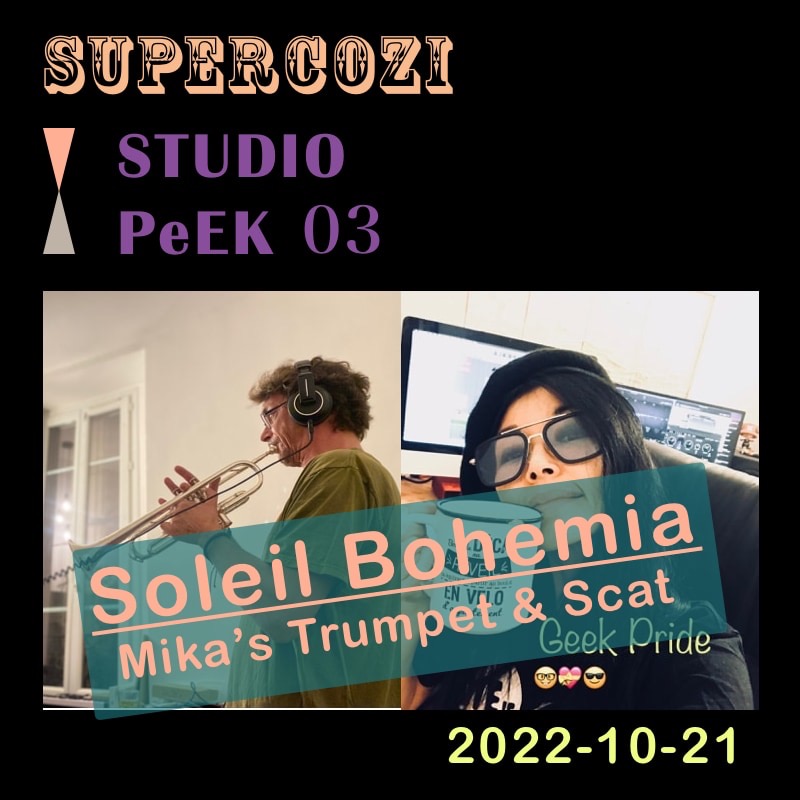 ( French & 日本語↓ ) ‘ STUDIO PeEk ‘ series new episode !! This time is a lil footage of Trumpet & Scat recording of my Nicoise friend MagiKal (a.k.a Michael Potter ) for my new Psy-Swing tune ‘ Soleil Bohemia ‘ ( 105BPM ) , that will be a part of my first 80 …
